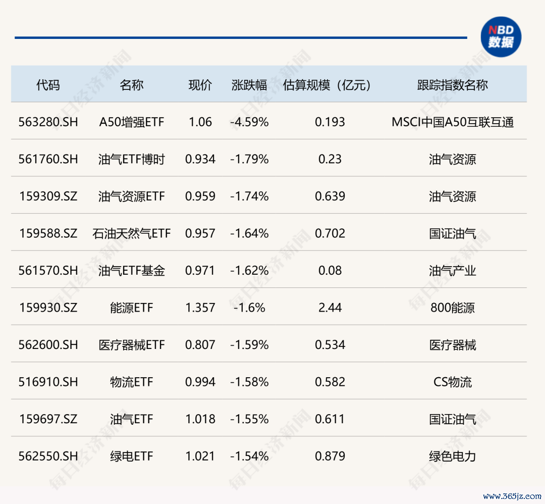 下跌方面,A50增强ETF跌逾4%,油气、物流等ETF跌逾1%。