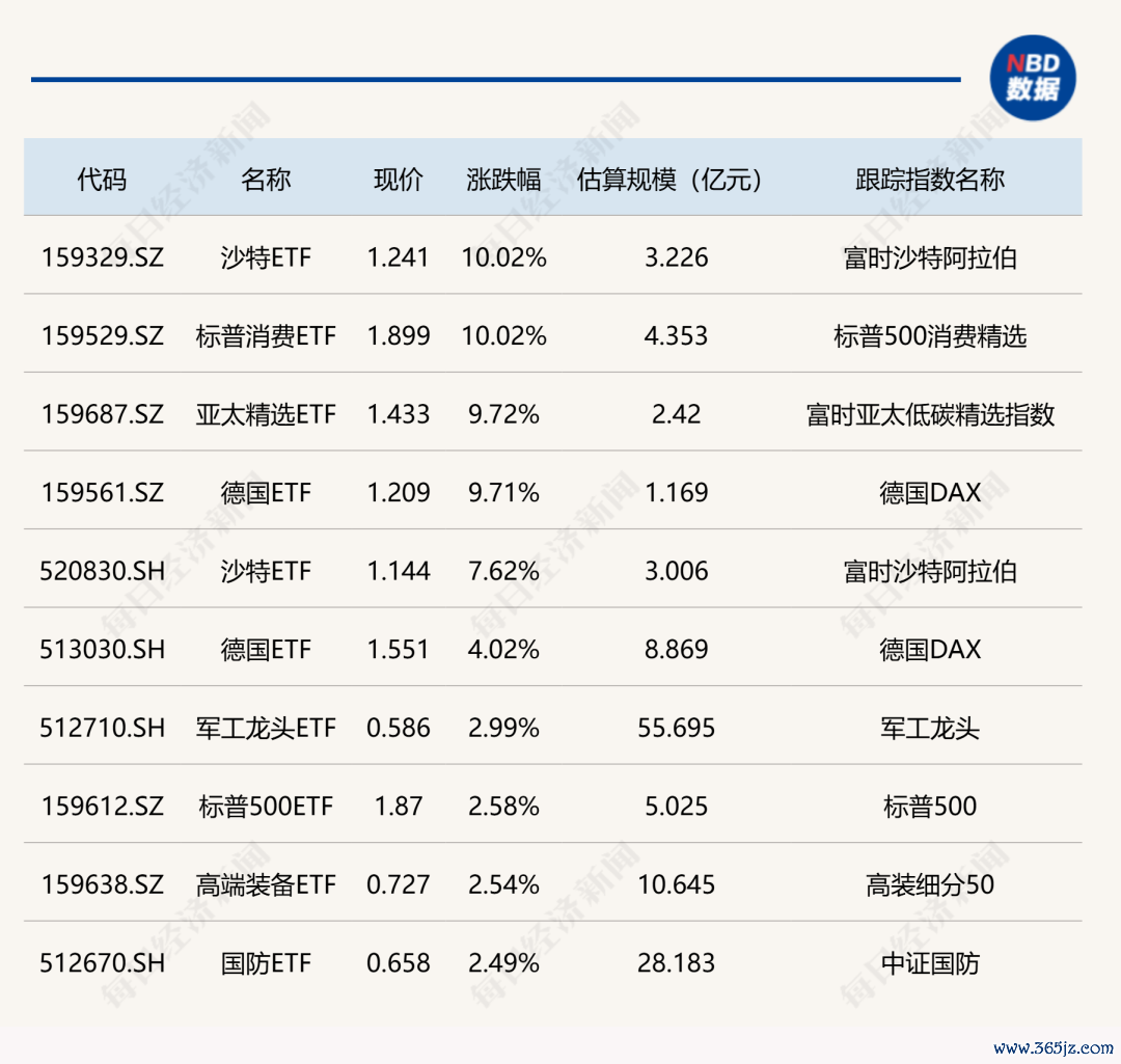 ETF涨跌幅方面,多只跨境ETF持续大涨,沙特ETF、标普消费ETF涨停,亚太精选ETF、德国ETF涨超9%。